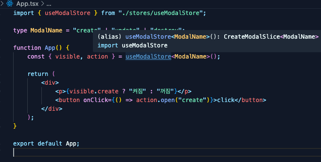 타입단언으로 리턴타입을 명시해주었다. 이로써 사용처에서 타입을 전달하여 modalStore까지 타입이 전달되고 State, Action에 타입이 전달될수있는 구조가 되었다.