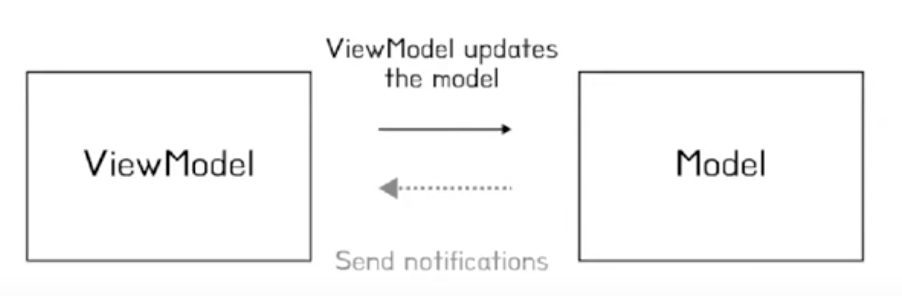 model은 요청을 받고 데이터를 변경하고 viewModel에게 Send Notifications 요청을 날리고, viewModel은 구독하고있는 model의 변경된 데이터가 변경되었다고 view에게 Send Notification 요청을 날립니다.