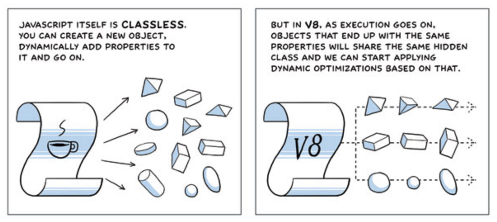 데이터가 동적으로 추가되면 선언 당시의 프로퍼티 데이터 타입이나 순서가 프로퍼티에 접근할 때와는 달라질 수 있기 때문에 프로퍼티 값을 읽을 때마다 프로퍼티를 찾아야한다. v8에서는 객체의 동적 변경으로 인한 프로퍼티 접근 비용을 낮추기 위해 히든 클래스를 사용한다.