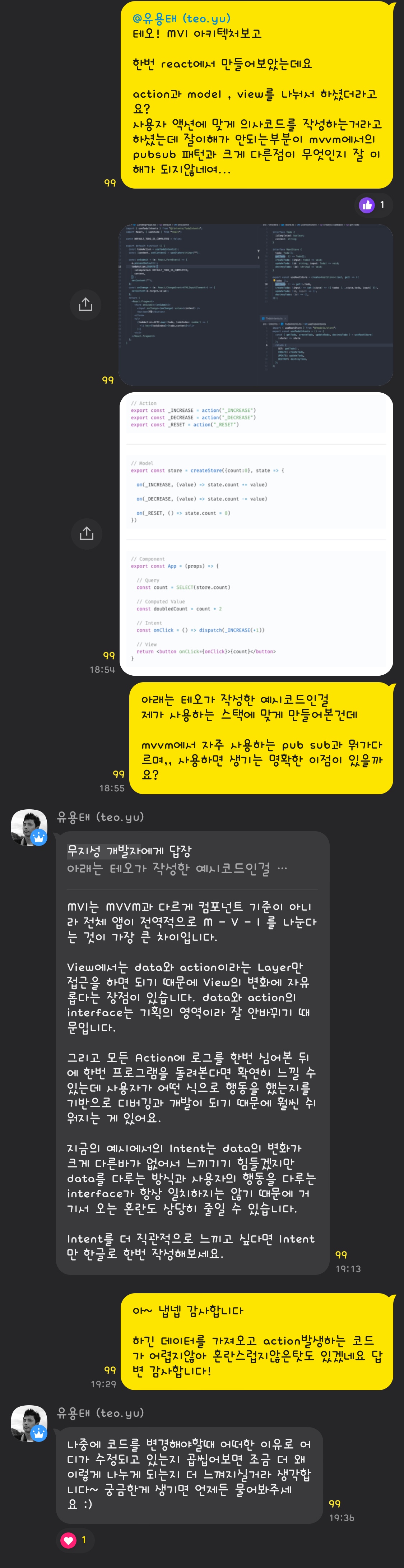 테오가 블로그 글올린것에대한 질문이 매우 편안하다! 최근에 MVI 패턴을 프론트엔드 적용시키는 글을 올리셔서 바로 작성해보았었다.