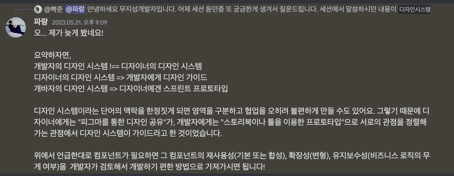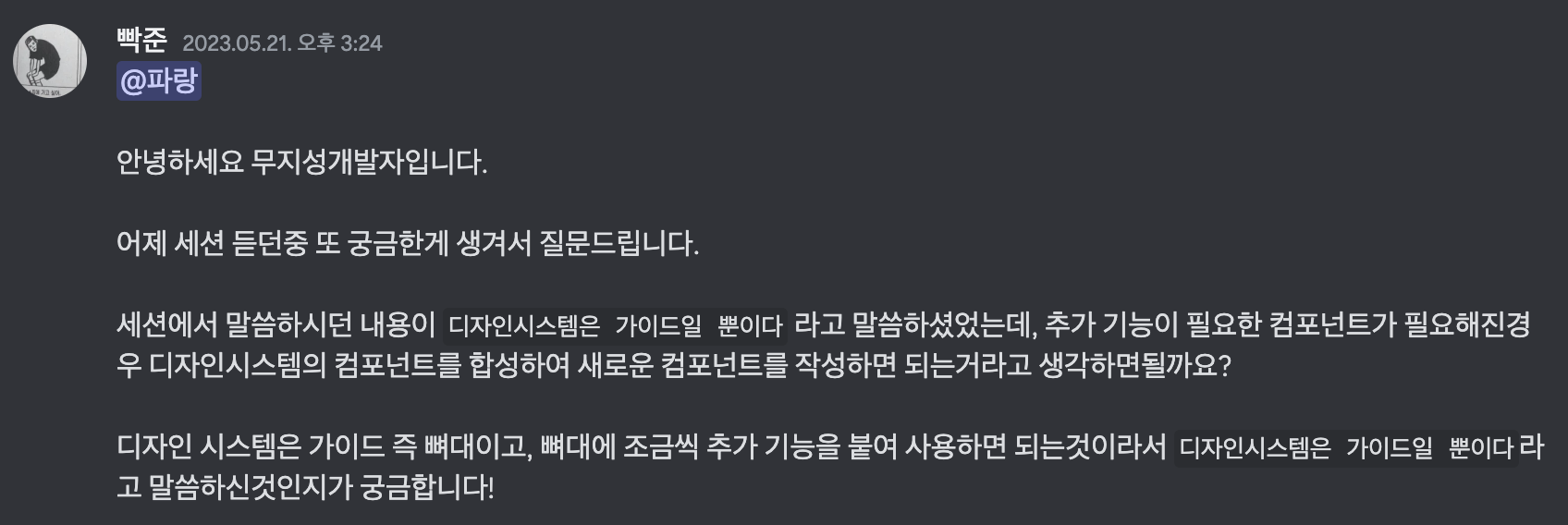 파랑의 세션은 디자인 시스템을 구축해내갈떄의 고민을 많이 공유해주셨었고 거기서 꿀팁을 알려주셨었다.